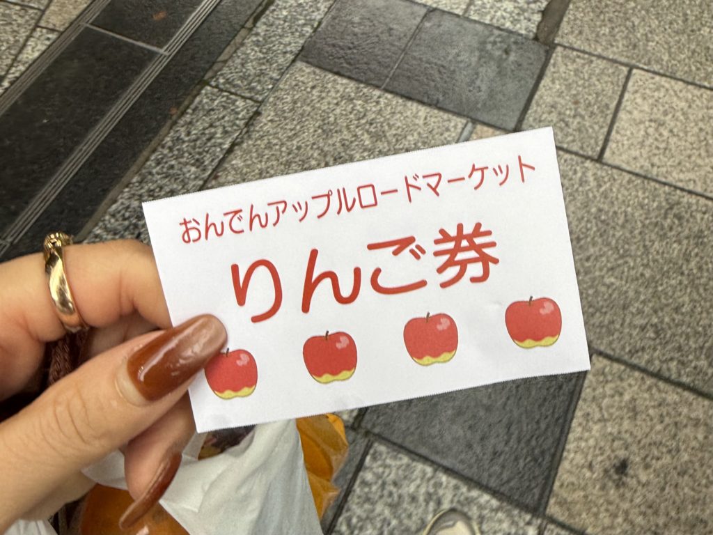 途中で「おんでんアップルマーケット」の前を通りかかり、りんごの引き換え券もいただきました。