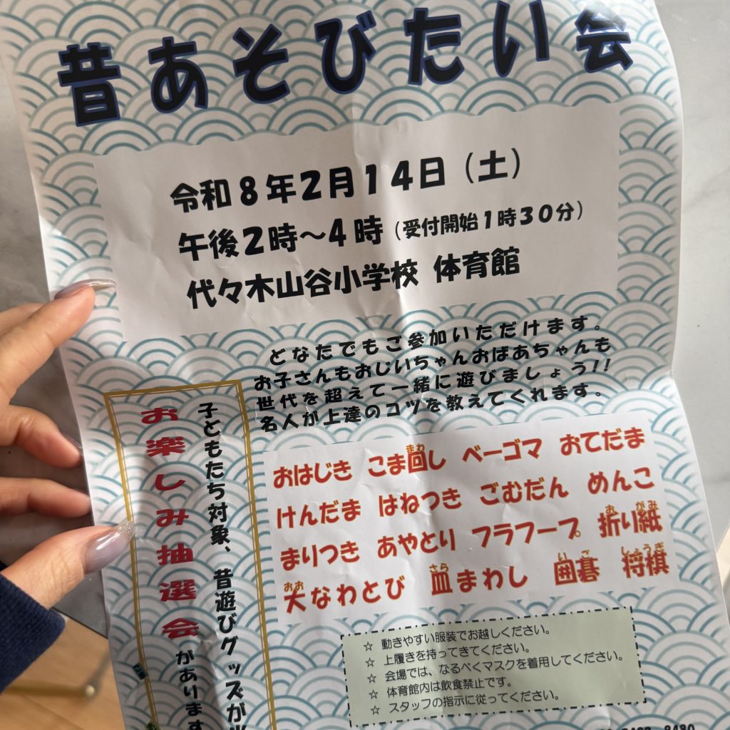 なにやら代々木山谷小学校の体育館で「昔あそびたい会」が開催されるとのこと。