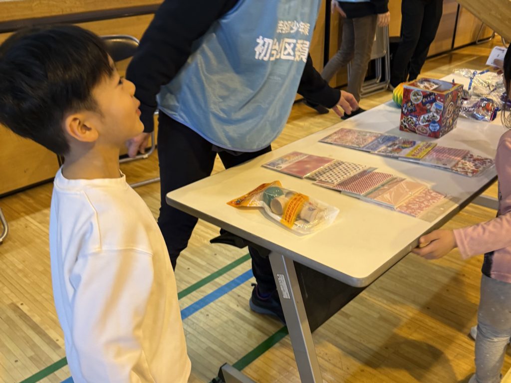景品は、けん玉やこま、折り紙など。