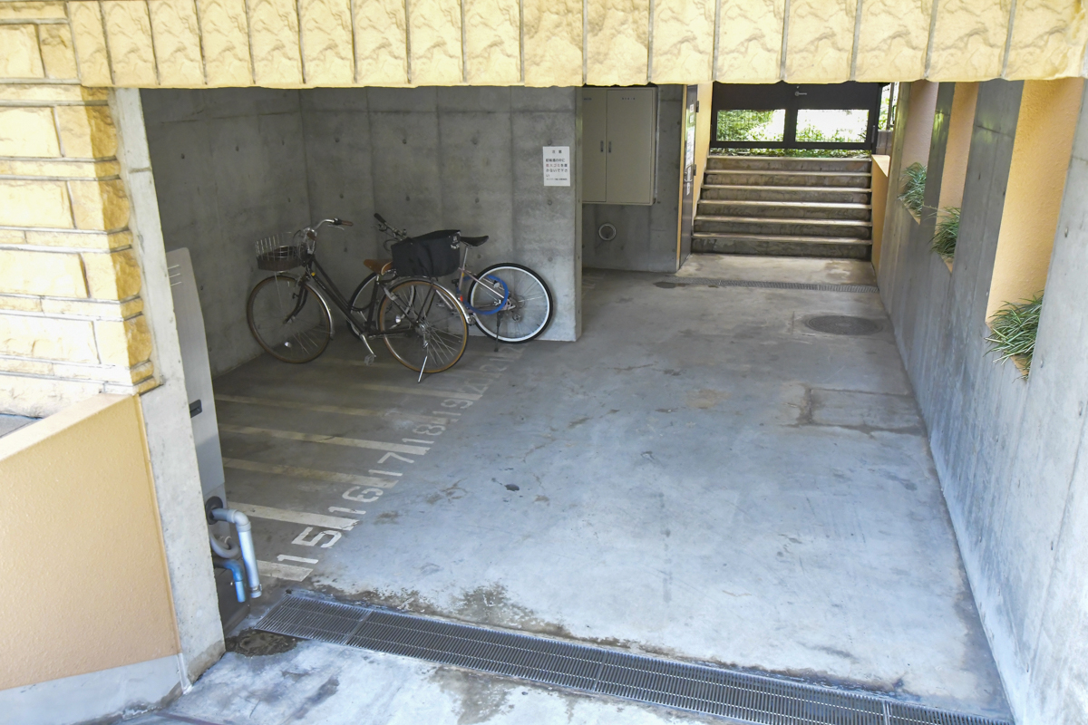 半地下のスペースには駐輪場、雨風は入らないですね。