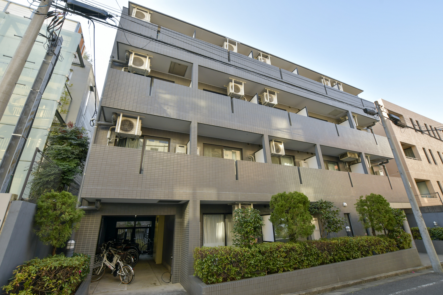 - ブラウンのタイル貼りの外観は落ち着きがあり飽きのこないデザインです。周りに植えられた木々が低層階のプライバシーを守っています。