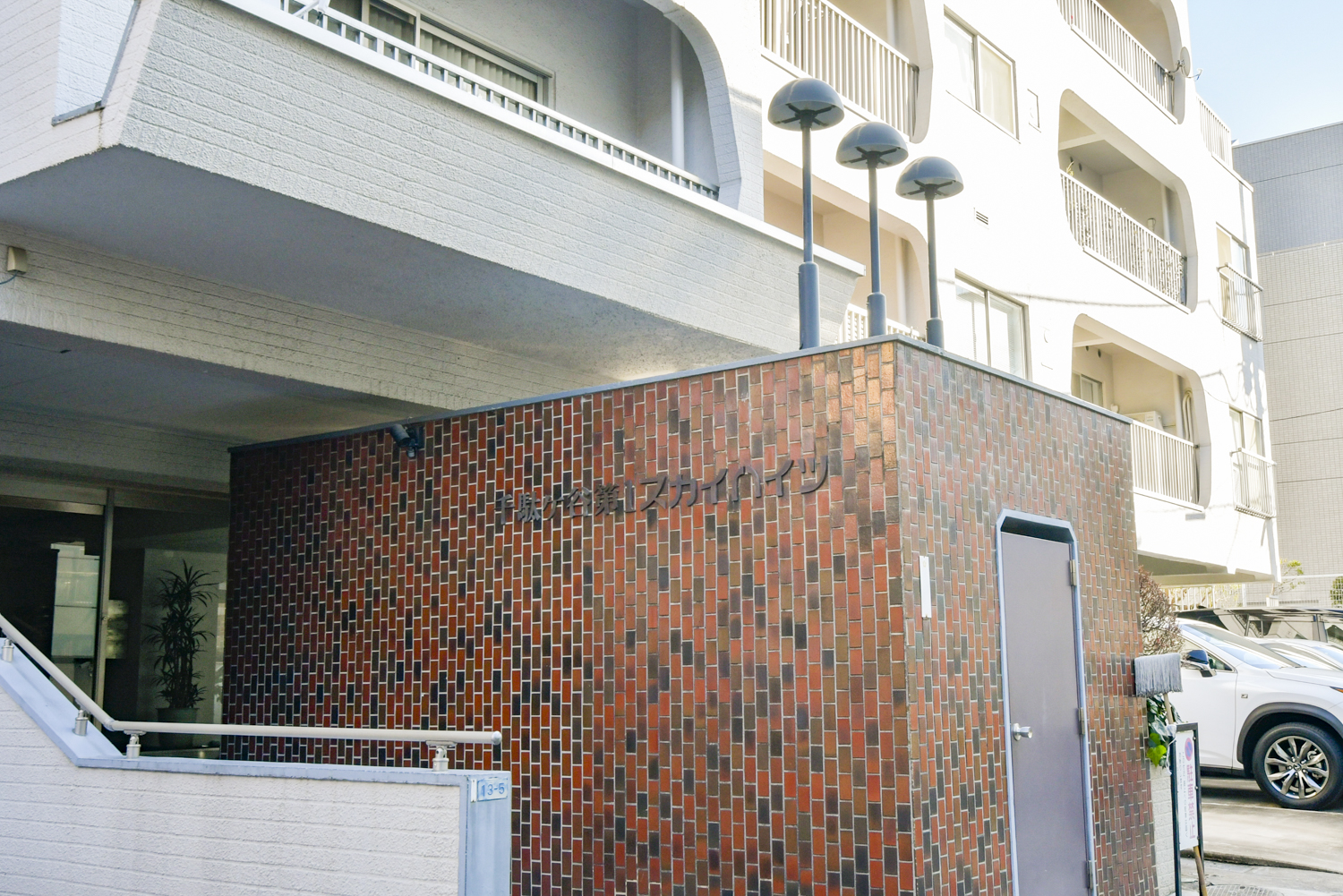 - 白を基調とした外観は清潔感があり、エントランスの茶色のタイル貼りの壁が落ち着いた印象を与えます。アプローチ部分にはスロープが設けられています。エントランスホールはグレーでまとめられていて、応接セットが置かれています。管理は日勤で共用部分の管理などにも配慮されています。