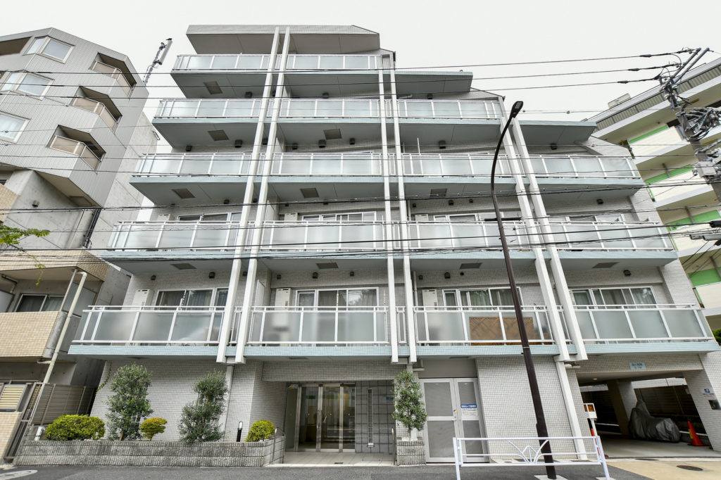 白を基調としたタイル貼りの外観が印象的なマンションです。色合いがスッキリとした近代的な作りです。