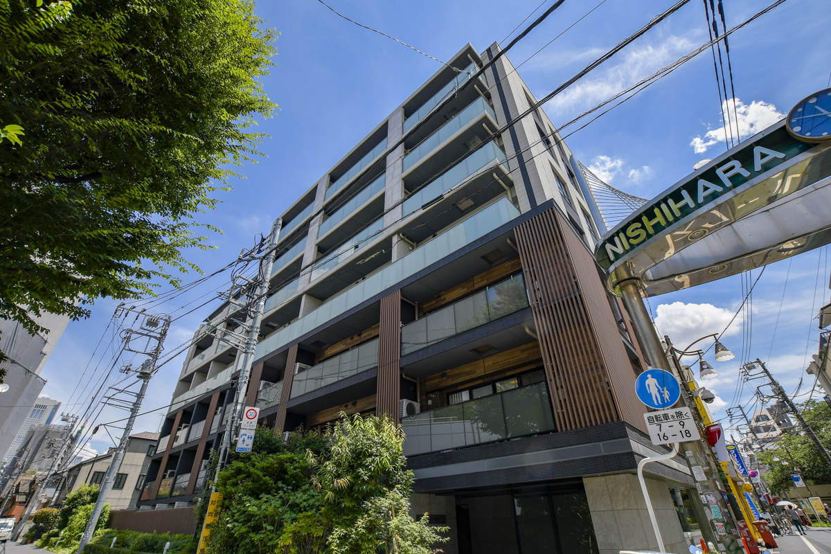 2017年と新しく築浅マンションに相応しいスタイリッシュな仕上がりとなっています。ご覧の通り幡ヶ谷駅前の西原商店街の入り口アーチのすぐ脇の立地ですので買い物は大変便利です。